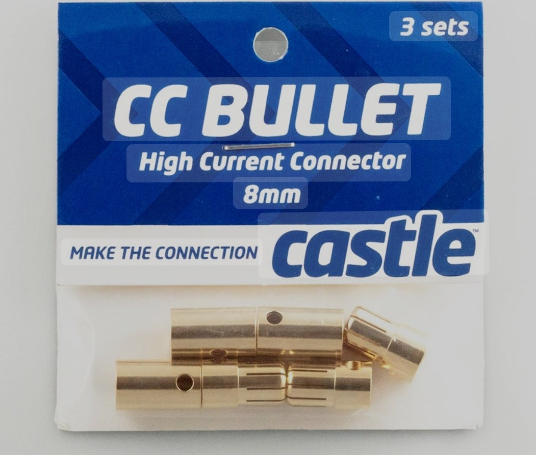 The Castle Creations 8.0mm High Current CC Bullet Connector Set is ideal for connecting motors, and batteries in extremely high current applications. Package includes three male bullets and three female bullets.